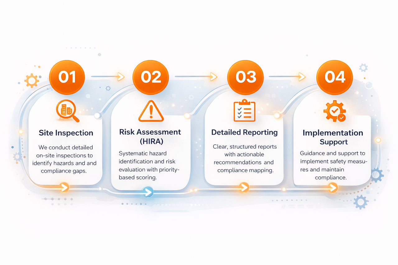 Identify hazards, compliance gaps, and safety risks through detailed inspections and reports. Aligned with safety laws, NABH, ISO 45001 etc.